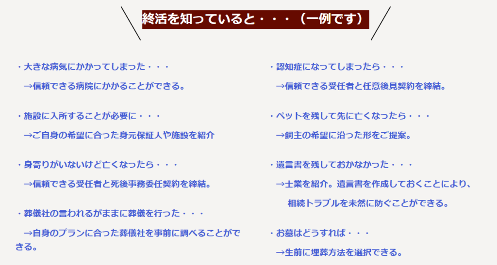 終活に必要な手続きや準備を学ぶことができます。また、ご自身やご家族の予期しない事態に備えることができます。お気軽にお問合せください。